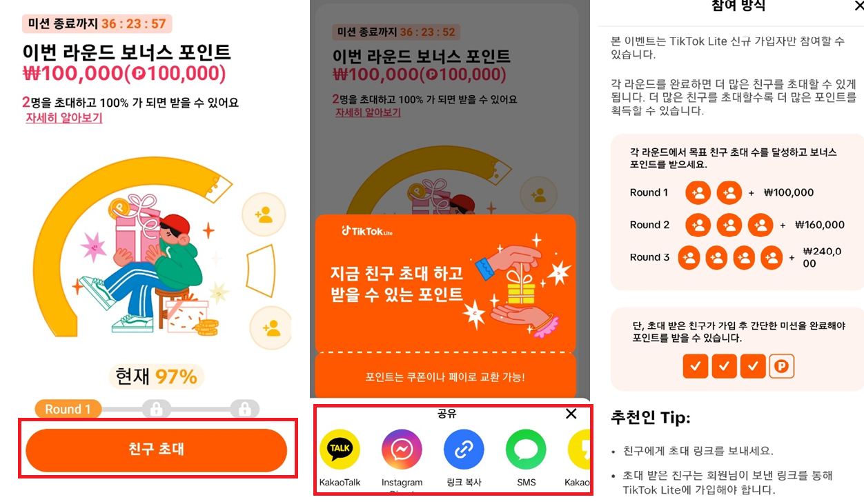 틱톡라이트에서는 친구를 초대하면 보상을 받을 수 있는 이벤트를 진행하고 있습니다. 이 이벤트는 신규 사용자에게 특히 유리하며( 한번도 안쓴 새 구글 계정으로 가입하면 기존 틱톡 사용자도 가입가능 + 안전함), 친구를 초대하고 친구가 앱을 다운 받고 10일간 출석 체크 하면 최대 60000원의 보너스를 받을 수 있습니다. 이벤트는 시간 제한이 있으며, 초대한 친구가 가입 후 일정 조건을 충족해야 보상을 받을 수 있습니다.